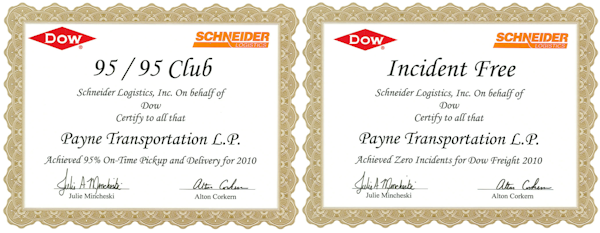 We had the privilege to attend the DOW/Scheinder Logistics Core Carrier Conference in Chicago were we were presented with two certificates of recognition. DOW maintains score cards on all their core carriers for on-time pick-up and deliveries and incident free which includes driver issues-claims etc.