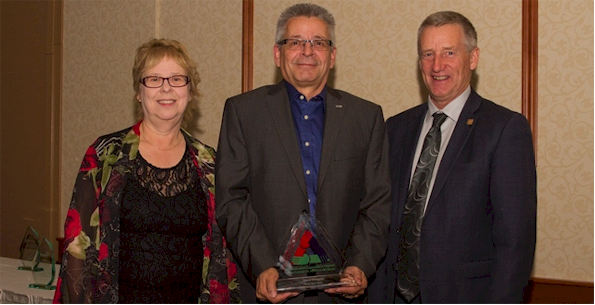 Judy Murphy, President and CEO of Safety Services Manitoba (the award sponsor), presented the trophy to Peter Bonneville, Director of Safety for Payne Transportation Ltd. at the SAFETYS gala on Wednesday, September 27 at the Victoria Inn Hotel in Winnipeg.