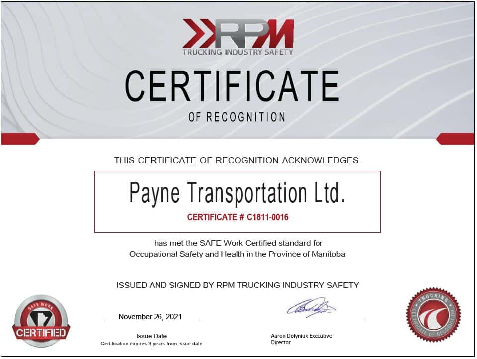 We are pleased to announce that Payne Transportation Ltd. has received our CERTIFICATE OF RECOGNITION from RPM . In order to receive this certification, we underwent a SAFE Work Certified audit, which is an independent review of a company’s health and safety program. Below are a few quotes from the auditors regarding our safety and health management system.